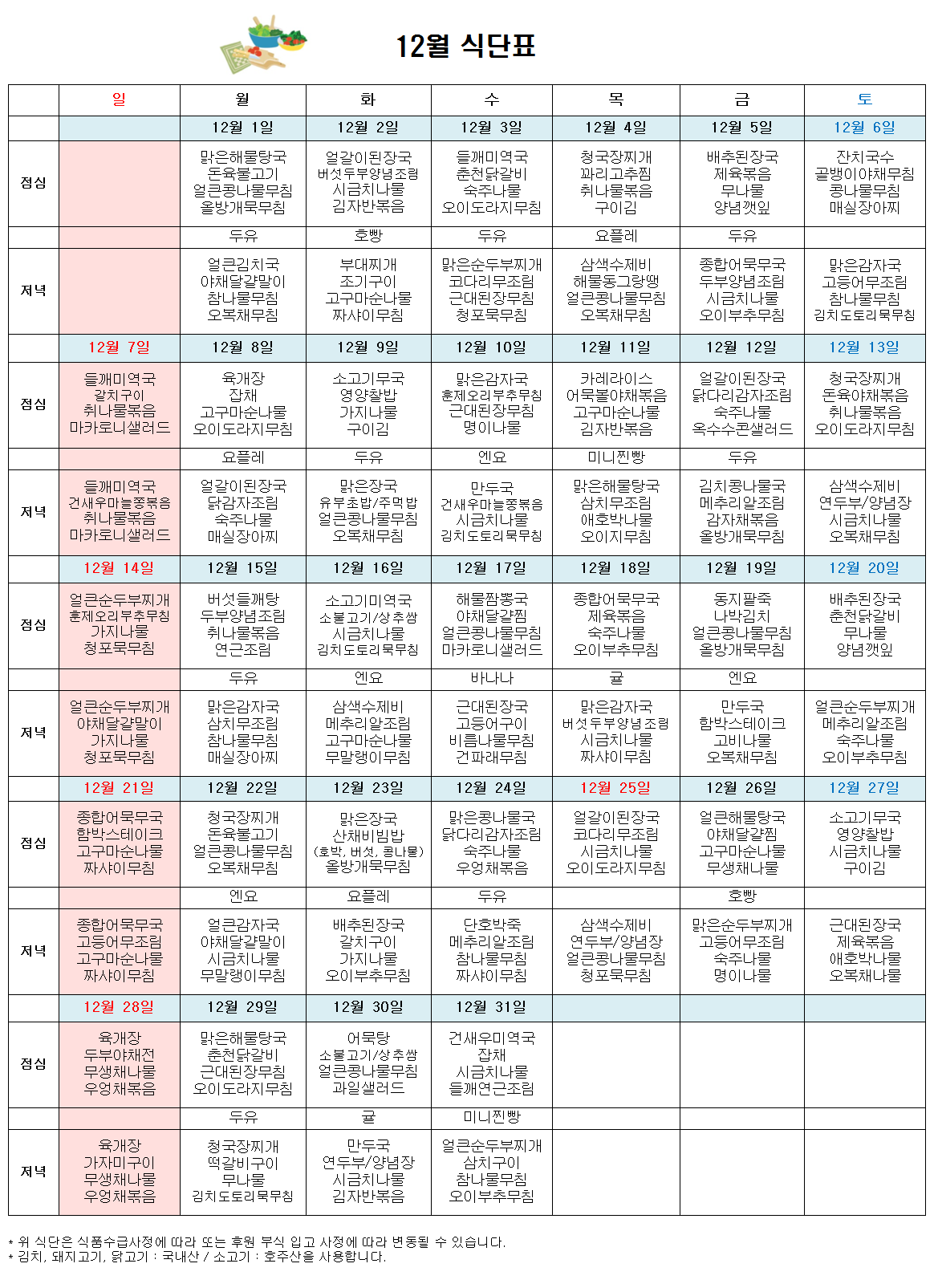 12월 주간보호 식단표